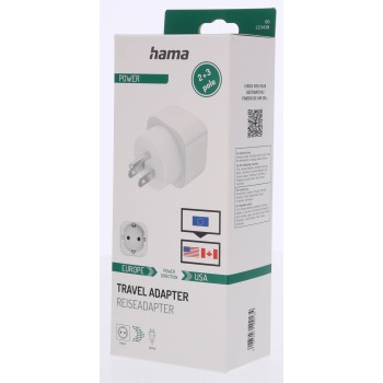 • UPOZORNENIE: Adaptér nemení napätie a frekvenciu! Používať len v suchom prostredí. Nekombinovať s inými adaptérmi. Adaptér nie je určený pre trvalé použitie.Poznámka: V Japonsku sa v mnohých oblastiach používajú dvojpólové zásuvky (bez ochranného kontaktu), tento adaptér s nimi nie je kompatibilný.Hama asistent pre výber zásuvkového adaptéru podľa krajiny:www.hama.com/travel-plugs
